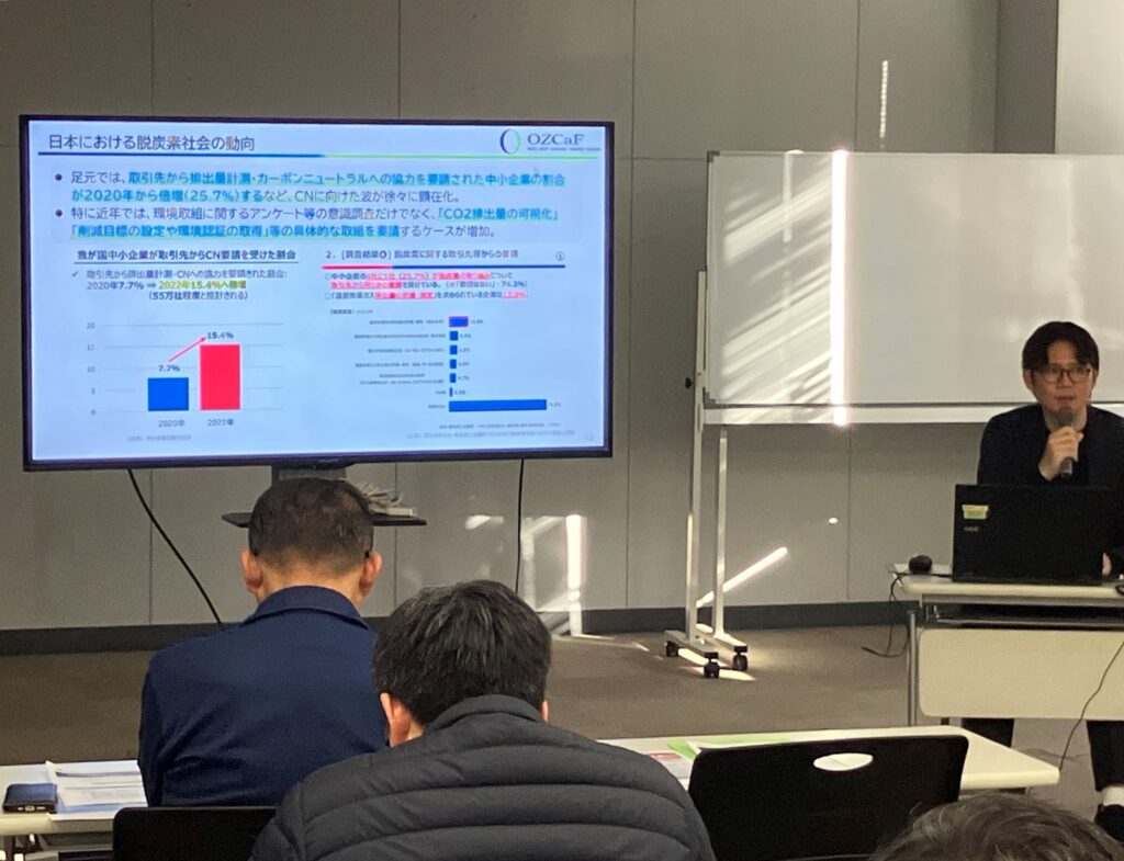 脱炭素への挑戦は、企業の生産性の向上や成長を生み出すチャンスにつながります。OZCaFからは、CO2排出量の可視化やSBT認定取得の重要性について説明いたしました。