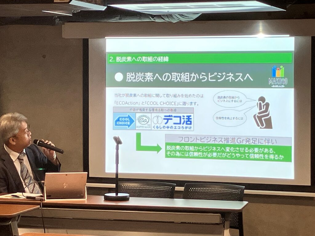 本セミナーでは、当会が「CO2の可視化・ SBT認定取得の重要性」について説明を行い、会員企業である株式会社マコト電気様からは「SBT認定取得・脱炭素経営の事例発表」をして頂きました。