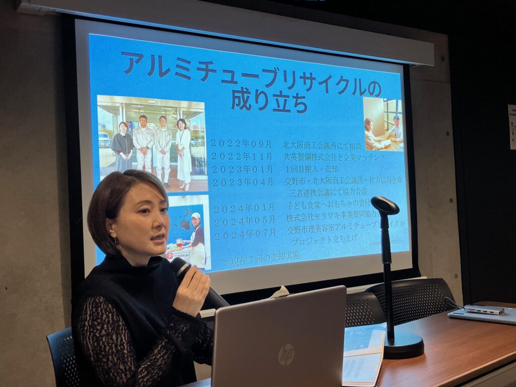 また、美容室から排出される使用済みアルミチューブを電気炉で溶解し、アルミ合金として再利用するという連携事例について、美容室 株式会社ボレロ様と、溶解・製造を担った共英製鋼株式会社様より取組みをご紹介いただきました。