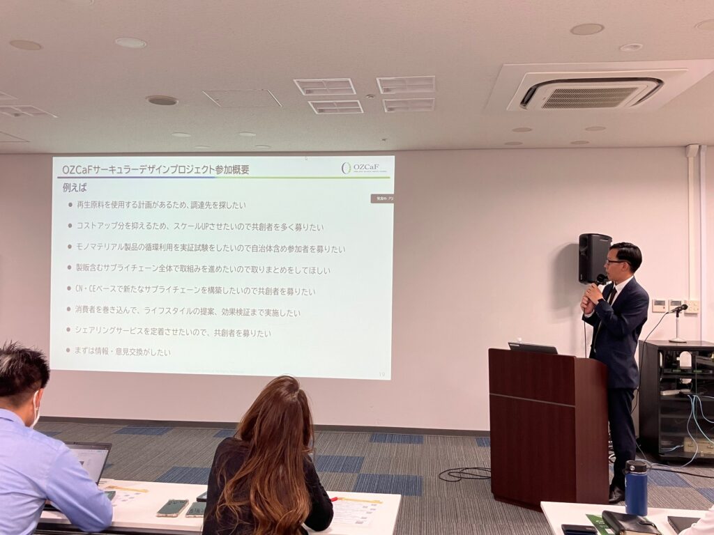 OSAKAゼロカーボン・スマートシティ・ファウンデーション「サーキュラーデザインプロジェクトチーム」からは「廃棄物を資源にする」「使用後の用途を設計した商品開発の仕組みをつくる」「長く使い・捨てない仕組みをつくる」といった、資源が当たり前に循環する仕組み創りをご説明させて頂きました。また、カーボンニュートラル実現に不可欠な「CO2排出量の見える化」や、「SBT認定取得の意義・重要性」についてもご説明いたしました。