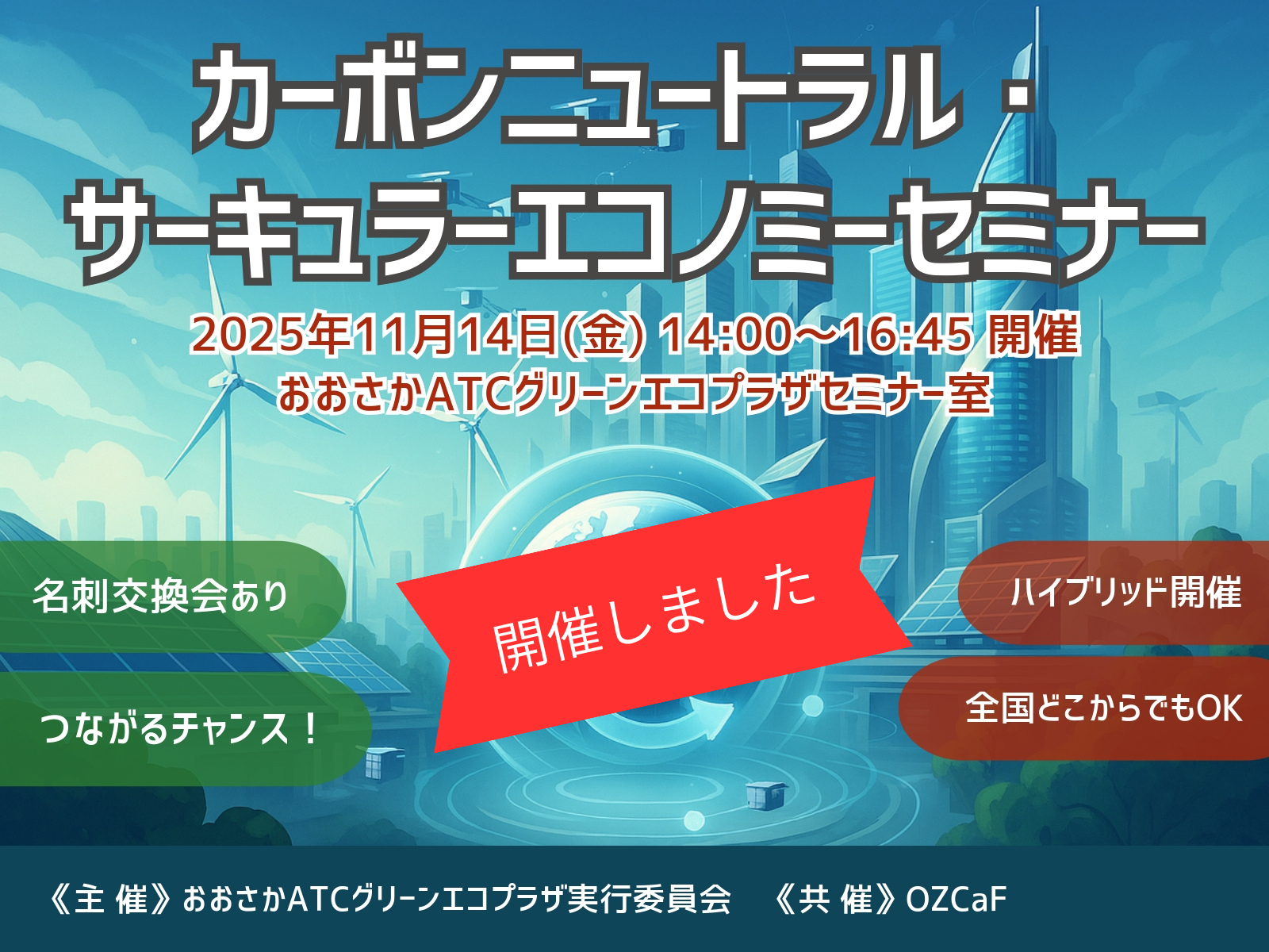 2025年11月14日(金)、おおさかATCグリーンエコプラザ実行委員会主催で「カーボンニュートラル・サーキュラーエコノミーセミナー」を開催しました。
