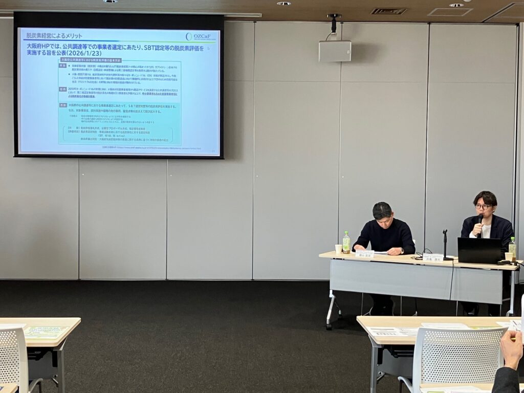 OZCaFからは脱炭素の国際的なイニシアティブ「中小企業版SBT※1」取得の意義・重要性についてや、CO2排出量の“見える化”、について解説させていただきました。
