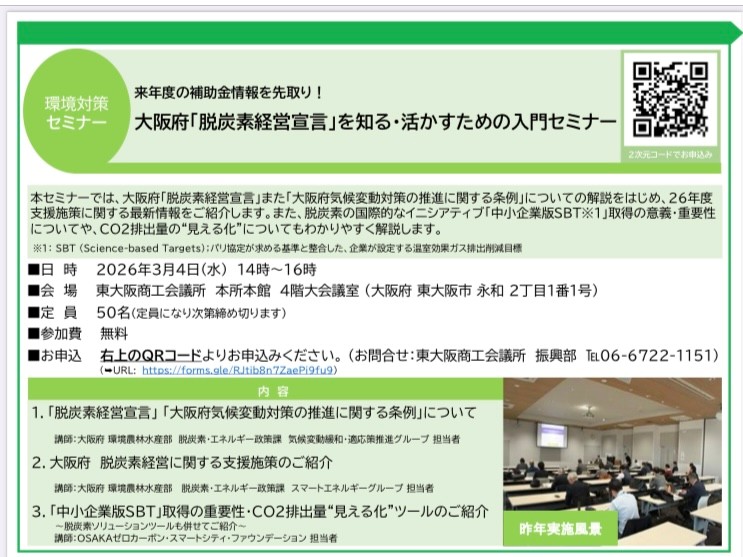 3月4日(水) 東大阪商工会議所 「脱炭素経営宣言」を知る・活かすための入門セミナーを開催しました
