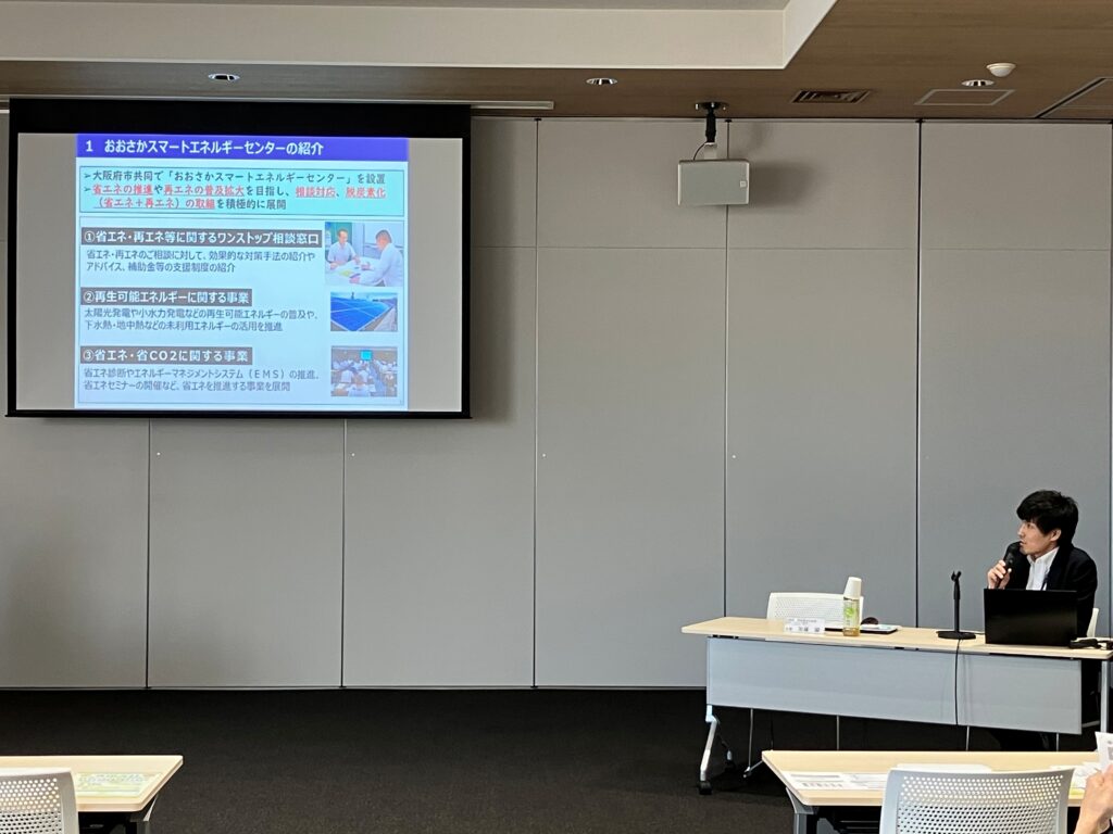 本セミナーでは、大阪府から「脱炭素経営宣言」また「大阪府気候変動対策の推進に関する条例」についての解説、また26年度、大阪府支援施策に関する最新情報のご紹介が行われました。
