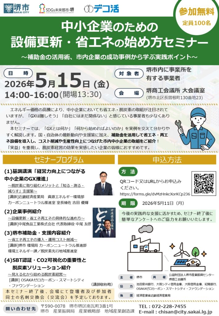 5月15日(金) 堺市主催 中小企業のための設備更新・省エネの始め方セミナー開催のご案内